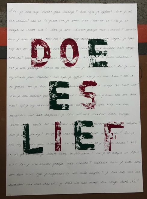 Deze poster is gemaakt in samenwerking met twee anderen. De poster is bedoeld om vervelende familieleden bewust te maken van hun commentaar aan de kersttafel. Op de achtergrond staan nare zinnen die gezegd zouden kunnen worden tijdens kerst. Deze zinnen zijn sierlijk geschreven, alsof ze geen kwaad doen. Op de voorgrond zien we duidelijk, grof en slordig de zin: doe es lief. De letters zijn gestempeld in de kerstkleuren, en lijken een wanhopige kreet. Het is genoeg geweest. Houd het gezellig rondom de kersttafel.